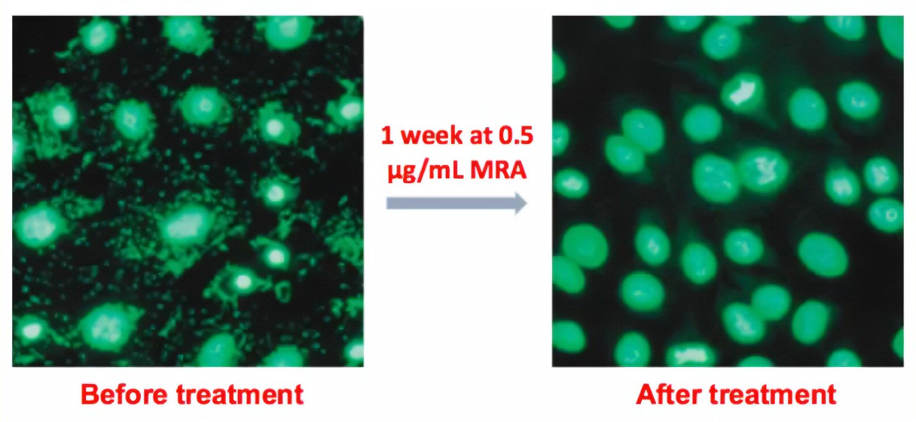 3. 向培養基中添加新鮮支原體去除劑溶液,每3-4天更換一次。兩周的治療應足以消除污染。有效工作濃度范圍為5-25µg/ml;10µg/ml適合大多數應用場景。